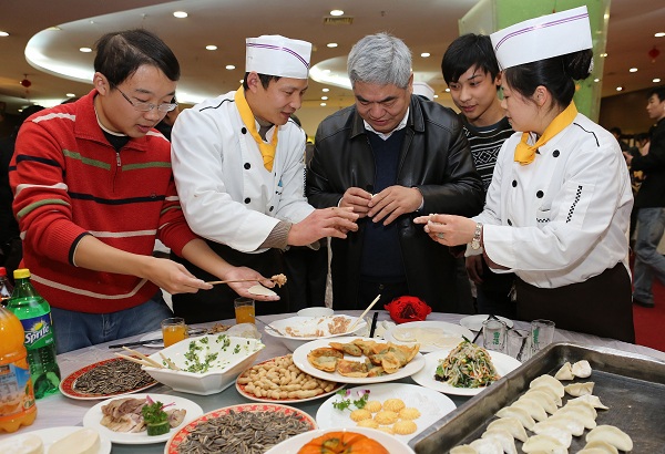 在学生食堂,洪银兴书记一行参加了由国防生、学生会、研究生会、后勤集团青年员工等200多人举行的“师生员工同乐,辞旧岁迎新年”活动,与大家一起包饺子、抽奖、做游戏、过新年。在男生独唱《莫斯科郊外的晚上》、国防生小提琴独奏《丰收渔歌》、笛子独奏《我是一个兵》等曲目的烘托和感染下,洪书记一行也应邀登台,加盟演出。洪银兴书记、杨忠副校长合唱的俄罗斯歌曲《喀秋莎》和潘毅副校长独唱的亲情歌曲《父亲》将迎新活动推向了高潮。