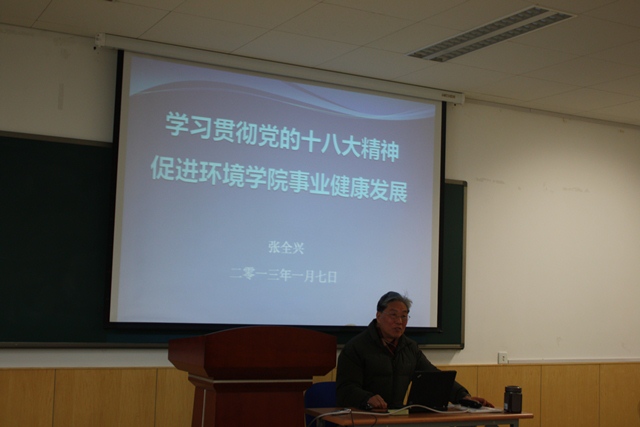1月7日下午,我校环境学院召开以学习贯彻十八大精神为主题的专题报告会,张全兴院士为全院教职工做了题为“学习贯彻党的十八大精神,促进环境学院事业健康发展”的报告。会议由院党委书记孙冶东主持。