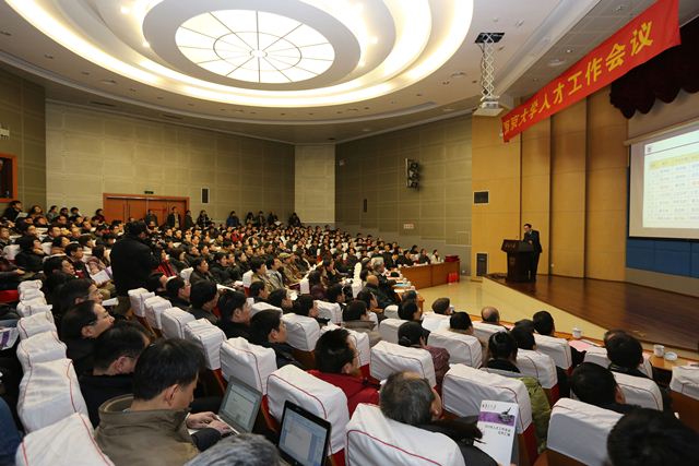 陈骏校长在讲话中总结了过去一年中我校人才工作取得的可喜进展:教师队伍整体素质有了进一步提升,长江学者、等多项重要人才计划的入选人数位居全国高校前列,学校推出了“登峰人才支持计划”等一系列重要举措。陈骏校长进一步分析了我校教师队伍的现状,指出缺少年轻院士、长江学者缺少重大成果、优秀年轻教师储备不足、队伍结构不合理,将影响我校教师的学术竞争力。陈骏校长强调,要按照“高水平”的目标、“高门槛”的标准、“高投入”的要求和“严考核”的机制开展今年的人才工作,归纳起来,就是“三高一严”。第一,要下最大的决心,建设高水平教师队伍,要加强对年轻(60岁以下)院士、长江学者特聘教授等高端人才的引进和培养,加大我校优秀年轻教师的储备,建设一支水平高、结构优的教师队伍;第二,要按一流的标准,构建教师准入的高门槛,要提高教师引进、晋升以及各项人才计划的准入门槛,同时用正确的考核机制检验人才,充分调动、激发人才的工作积极性和创造性;第三,要以最大的热情,保证队伍建设的高投入,在保障经济上高投入的同时更要保证院系领导班子精力上的高投入,同时全体教师也都要静下心来全身心投入学术;第四,要对各类人才进行严格考核,以岗位聘用为基础,强化聘期考核,多出高水平研究成果。
