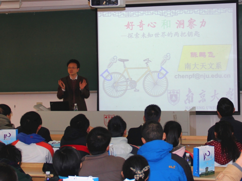 启动会上,我校天文与空间科学学院陈鹏飞教授做了题为《好奇心和洞察力:探索未知世界的两把钥匙》的报告。报告风趣幽默,深入浅出,通过大量生动的案例引导中学生感受日常生活中的科学现象,树立科学思维,建立科学态度,提高科学素养,并希望同学们以“中学生英才计划”为阶梯,充分利用计划所提供的各项资源,开展早期的科研训练,努力成为青少年中的科技创新人才。