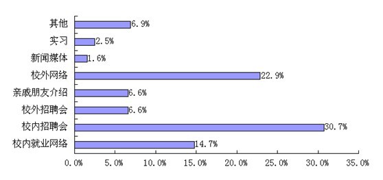2013届毕业生人均获取offer2.61个。其中,2个offer的学生最多,有27.6%。获得2个或3个offer的超过一半,占53.6%,毕业生就业基本面较为乐观。毕业生签约单位的信息来源主要是校内招聘(30.7%)、校外网络(22.9%)以及校内就业网络(14.7%)