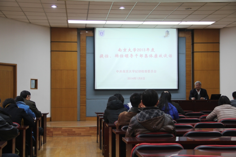 1月6日, 我校纪委举行2013年度提任、转任中层领导干部集体廉政谈话会。本次廉政谈话对象应有30人,除个别出差、上课需下次“补课”外,其余人员全部到会。党委书记洪银兴到会讲话,党委副书记、纪委书记任利剑主谈,法学院教授狄小华作专题讲座。谈话会由纪委副书记、监察处处长张兆干主持。