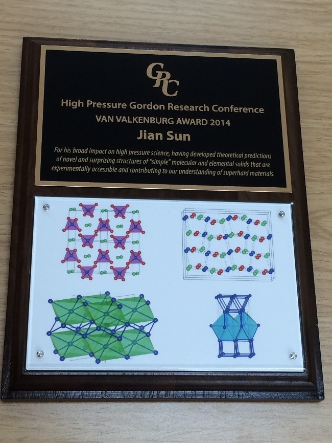 2014年6月,在美国新英格兰大学举办的高压戈登会议(High pressure Gordon Research Conference 2014)上,我校物理学院孙建教授获得GRC Alvin Van Valkenburg奖,并受邀做了专题报告。Van Valkenburg奖以高压科学最重要的研究装置之一——金刚石对顶砧的共同发明人——Alvin Van Valkenburg的名字命名,用以表彰高压研究领域中做出突出贡献的年轻科学家,是国际高压科学领域内的知名奖项。这个奖每两年颁发一次,一次一人,在高压戈登会议期间颁发。同时颁发的还有J.C. Jamieson杰出研究生奖。本年度的Jamieson奖获得者是我校校友——地球科学与工程学院2007届本科毕业生,现在在美国斯坦福大学工作的林昱同学。(物理学院 科学技术处)