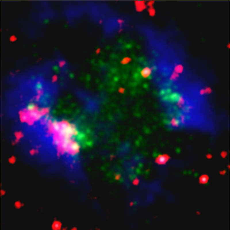 图1:星系Sextans A的多波段图像:蓝色部分代表的Very Large Array射电望远镜所探测到的氢原子质量分布,绿色是GALEX卫星所探测的来自大质量恒星的紫外发射,红色代表的是Herschel红外望远镜所探测到的来自尘埃的红外发射(图由施勇制作和提供)。