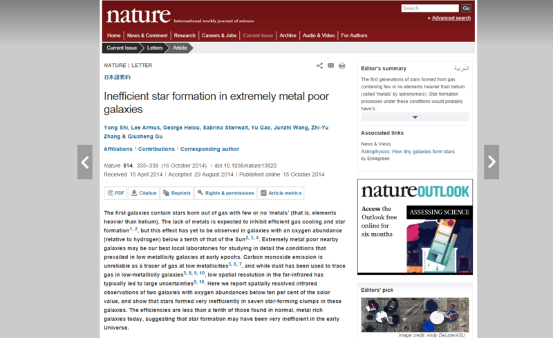 施勇教授团队在对Sextans A和ESO146-G14两个临近地球的恒星星系进行观测时(前者距离地球大约5百万光年,后者距离地球大约7千万光年,金属元素含量各自只有我们银河系重元素含量的7%和9%),发现其恒星的形成效率远低于类银河系星系里的恒星形成效率,大约低10-100倍。这从一定意义上为上述理论模型提供了实验数据,暗示了早期宇宙里恒星的诞生比今天的恒星要难得多,这对于星系和恒星起源的研究具有重要的科学价值。