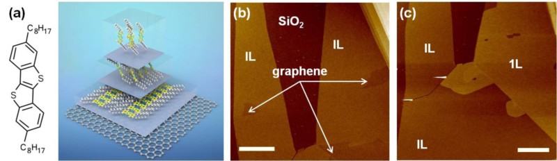 有机晶体是半导体材料领域的一个重要分支,已经广泛应用于太阳能电池、显示器等领域。研究组与东凯发学、北京师范大学、中科大、日本国立材料研究所、香港中文大学等单位合作,将有机晶体与二维材料的概念相结合,在国际上首次利用范德华外延制备出大面积、高质量的单层分子晶体(图2)。在石墨烯衬底上制备出“石墨烯 – 分子晶体 - 金”三明治结构的高开关比场效应晶体管,并实现了“与门”、“或门”逻辑运算功能。进一步,在氮化硼衬底制备的单层C8-BTBT分子晶体场效应晶体管,室温下迁移率能到达10cm2/Vs, 比之前报道的结果提高了两个数量级以上。该项工作将二维晶体的概念从无机材料引入到有机材料,极大的扩展了二维材料研究领域,为未来二维材料在电子和光电器件的应用打开了一个新的局面。