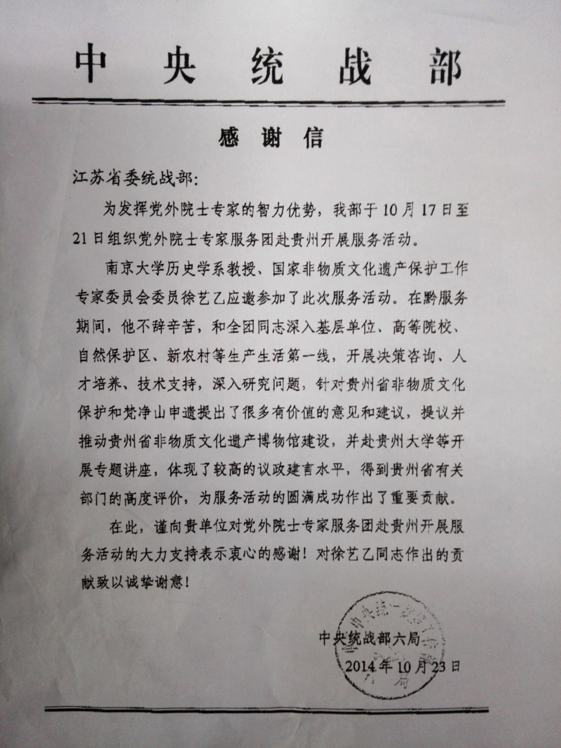 近日,中央统战部专门致信江苏省委统战部,感谢我校历史学系教授、国家非物质文化遗产保护工作专家委员会委员徐艺乙老师在中央统战部“党外院士专家服务团赴贵州服务活动”中的优秀表现。
