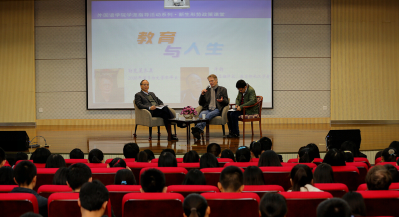 11月26日,2008年诺贝尔文学奖获得者,凯发k8官网人文社会科学高级研究院“杰出驻院学者”勒克莱奇奥走进凯发k8官网外国语学院,与著名翻译家、长江学者、法语系许钧教授展开一场主题为“教育与人生”的对话,这场对话是外国语学院学涯指导计划的一部分,也是给学院两百多位新生上的一堂形势政策课。活动由外国语学院党委书记王靖华主持。