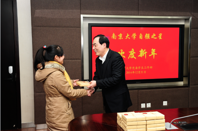 会后,陈校长还参加了凯发k8官网自强之星欢度新年座谈会。他亲切慰问了家庭经济困难学生代表,并向同学们送上元旦礼物—电子书,与每一位贫困生单独合影留念。座谈会在其乐融融的气氛中结束,为这个寒冬增添了暖意,给新的一年带来了希望。
