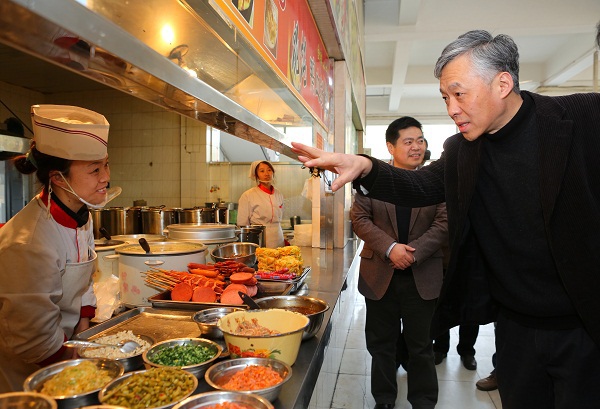 在三食堂,张异宾书记感谢食堂工作人员在服务师生生活方面所做的扎实工作,询问了饭菜质量和卫生安全等问题。张异宾书记来到学生宿舍,向坚持岗位的宿管人员表示慰问。